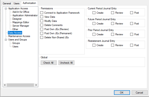 - Use the expandable hierarchy in the left panel to choose areas of functionality. Permissions for each category are listed in the right panel. Select or clear the appropriate check boxes to grant or deny permissions to the group.