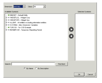 Field Description Available Symbols and Selected Symbols Find symbols in the Available Symbols list and click the arrow to move them to the Selected Symbols list. You may select as many symbols as necessary. If you want to prompt Report Users to select symbols for a particular dimension (for example, an entity) when they open the template, do not select a symbol for that dimension. You must remember however, to make sure users are allowed to select symbols for that dimension when you publish the template.