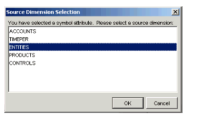 If the Publisher selects an attribute whose value is dependent on the symbol selection in another dimension, the Source Dimension Selection dialog appears.