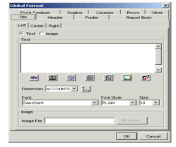 Icon Description To insert the schedule name, description, or both, into the report title. This option applies only if the report contains schedule information. To insert the date into the report title. To insert the time into the report title. To insert the page number into the report title. To insert the page number and total number of pages into the report title — for example, “2 of 10”. To insert the name of the template into the report title. To insert the current user’s full name into the report title. To insert a list of the report’s root symbols for a particular dimension into the report title. Make sure you select the appropriate dimension in the Dimension field. - You can insert attribute values into the title by inserting an attribute token. To insert an attribute token into the title, enter the following into the Text field:
