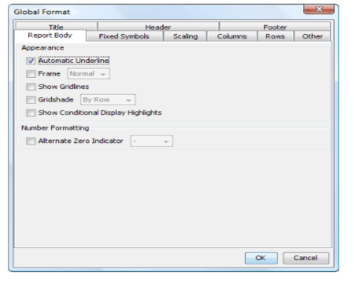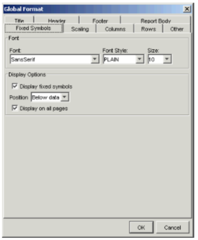 | body | The body of the report consists of the data. You can specify the font for data displayed. Also, you can choose to either include or omit fixed symbols in the report. |