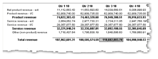 For example, in the following report, the cell containing total revenue for the third quarter of 2003 stands out from the rest of the report.