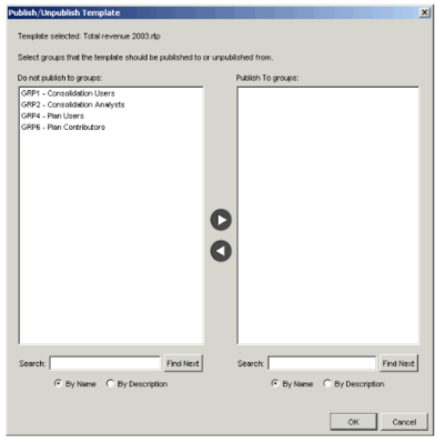 - In the Do not publish to groups field, select the groups to which you want to publish the template, and move them to the Publish to groups field using the right arrow button. You can select more than one group at a time by holding down the Ctrl key while making your selections.