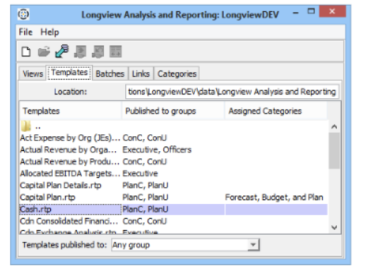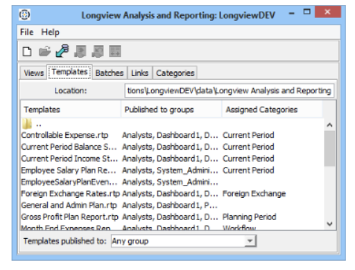 - Open the Longview Analysis and Reporting dialog and click the Template stab. A list of templates appears.