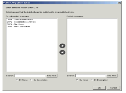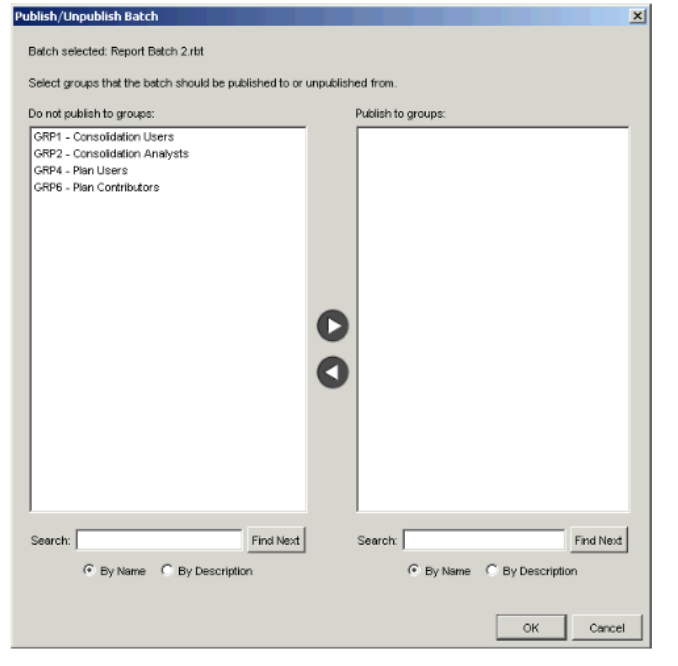 - If you selected only one batch file in step 3, or multiple batch files that were originally published to exactly the same groups, the Publish/Unpublish Batch dialog appears.