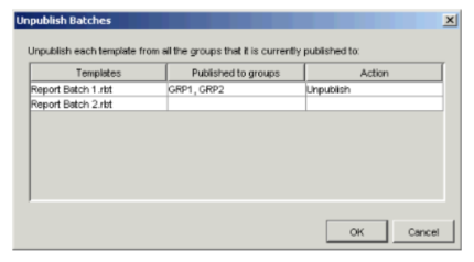 - If you selected more than one batch file in step 3, and those batch files were originally published to different groups, the Unpublish Batches dialog appears listing the templates you selected, and the groups to which they were originally published.
