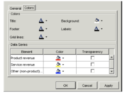 Field Description Title Select a color for the title. Footer Select a color for the footer. Grid lines Select a color for the grid lines. Background Select a color for the background. Labels Select a color for the chart’s labels. - For the Data Series section, you can select a color for each symbol in the down dimension of the chart. To make the color for a symbol transparent, so that you can see the symbols behind it, select Transparency.