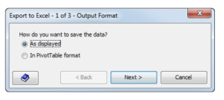 Note: If you are working with a report that contains more than 255 columns, the “As displayed” option is unavailable and the “In PivotTable format” option is selected by default.