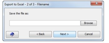 Field Description As displayed To display data in the Excel worksheet exactly as it is in the view. If you select this option, you cannot change the orientation in the Excel worksheet, as you can in the original view. In PivotTable format To display data in PivotTable format. This format allows you to create PivotTable reports in Excel. For more information, see your Microsoft Excel documentation. - Click Next. The Export to Excel - 2 of 3 - Filename dialog appears.
