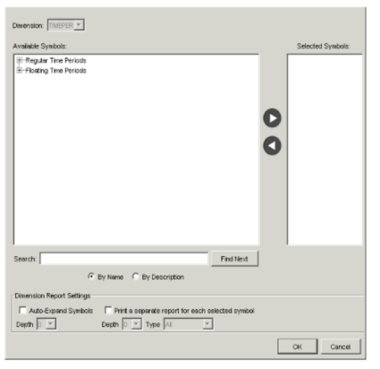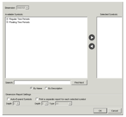 Field Description Available Symbols The available root symbols for the dimension appear in this field. When you find a symbol to use as a root symbol for that dimension, make sure the symbol is highlighted, and click the right arrow button to move the symbol to the Selected Symbols list. (If you know the name of a symbol, you can also type the name in the text field beside the Find Next button, and then click the button.) - Repeat step 5 for each root symbol to include in the report for that dimension.