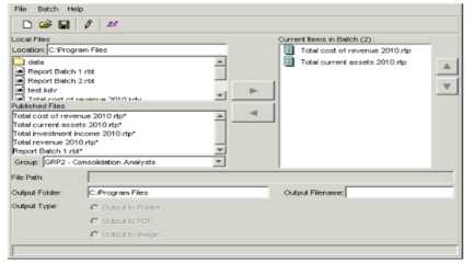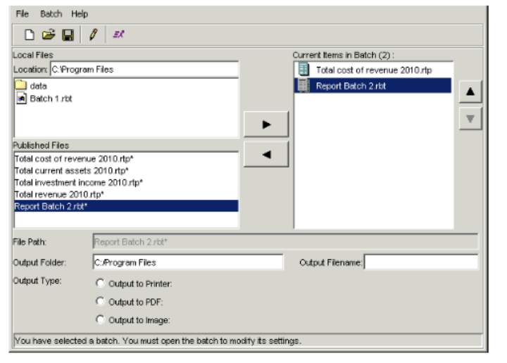 - The Local batch files section lists the report batches you have saved locally. The Published batch files section lists the report batches the Report Publisher has published to the database. Select the report batch to which you want to add a batch and choose File > Open. The Edit Report Batch dialog appears.