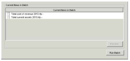 - If, when preparing the report template, you decided to keep all dimensions frozen (to prevent users from selecting any of the symbols in the report), the report appears in the Current Items in Batch field. Proceed to step 12.