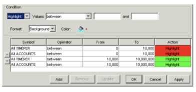 Values Specify the condition you want to apply to the data. For example, you can choose to have values between 0 and 10,000,000 highlighted, filtered, or suppressed. - Highlight: To highlight the cells containing data meeting the condition.