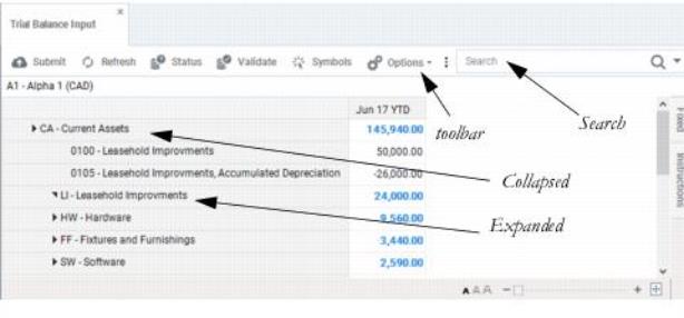 Your App Developer has set up your Data Grids so that the rows and columns contain specific dimensions and symbols. Rows and columns may contain nested dimensions to make it easier to manipulate data in the grid. You can expand and collapse symbols in the rows or columns to view the desired data in the grid.