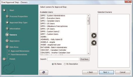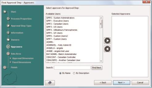- When you are finished, click Next. The Approvers dialog of the wizard appears.