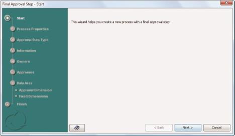 - Choose File > New > Approval Process Using Wizard. The Start dialog of the wizard appears.