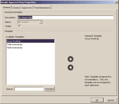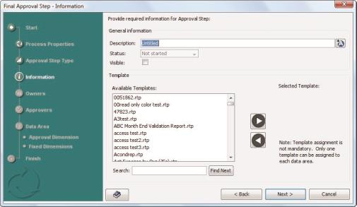 - If you want, you can associate a Longview Analysis and Reporting report template (.rtp) to each step to facilitate the viewing of approval data from the web. You can associate only one report template to a Data Area.
