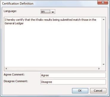 If you select the Certify data field in step 6 of Creating a Simple Process, or step 6 of Creating a Hierarchical Process, the Define Certification Definition menu item is active (otherwise, it is unavailable). This dialog is used to customize the certification message that users receive when they certify data in an approval process on the web. For more information, see Certifying data in an approval process.