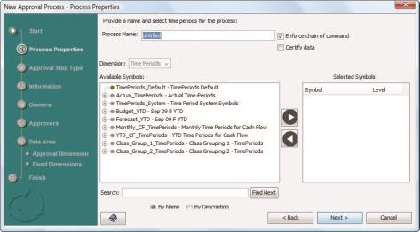 - For the Available Symbols list, select the Time Period symbols for this process, and click the arrow keys to move them to the Selected Symbols list. When you select time period symbols, you must select all levels.