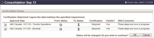 - When you are ready to submit your data, click Update. A Confirm Status Change dialog appears. The Certification Statement specified in the creation of the approval process displays above the Approval Step.