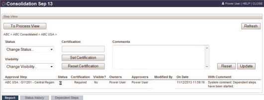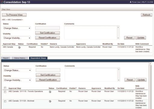 - If you are working on a hierarchical approval step, you can also certify the data of multiple dependent steps simultaneously. To do so, click the Dependent Steps tab.